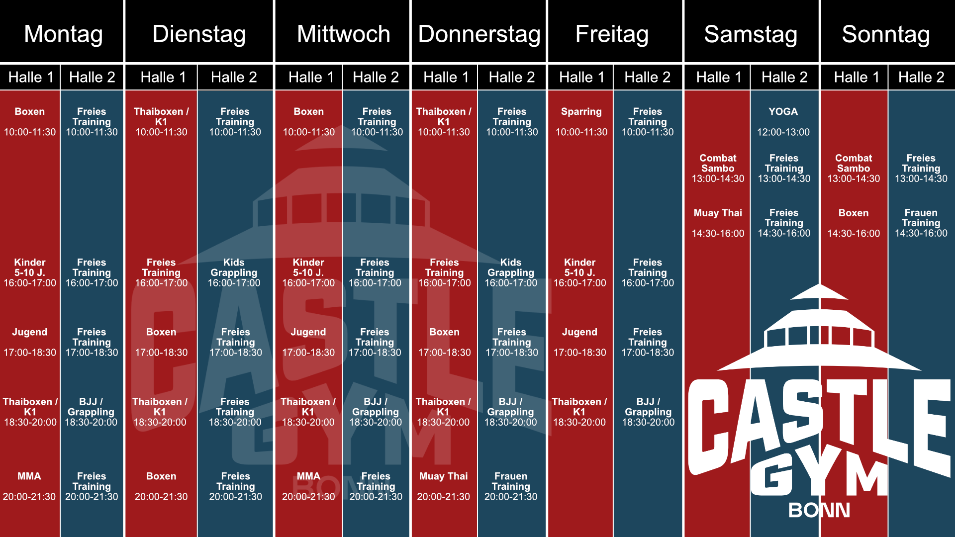 Wir trainieren an sieben Tagen der Woche, du entscheidest, wie oft du trainieren möchtest und was du trainieren willst, sieh dir unseren Trainingsplan an.